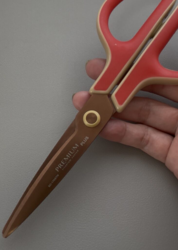 カットする時は、粘着面がハサミにまとわりつきにくいように「プラス・プレミアムハサミ」のようにベタつき防止加工のフッ素コートやチタンコートハサミを使うのがおすすめ。