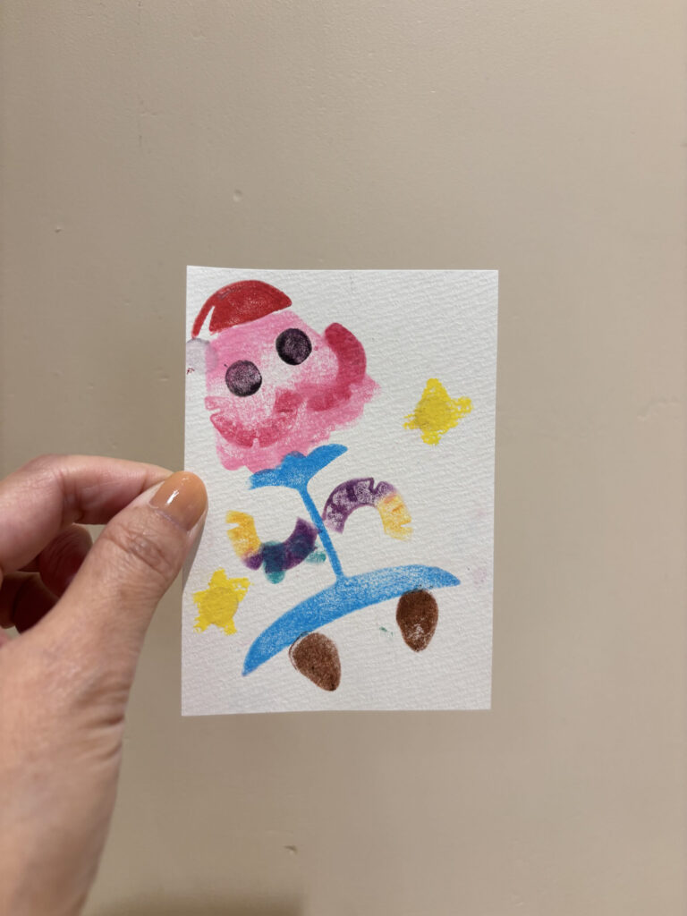 また、別のお子さんは、最初にゼリーをスタンプする位置が少し斜めにズレてしまいました。 「あ、紙を取り替えてあげないといけないかな?」としばらく様子を見ていました。(中にはもういやだ!とあきらめてしまう場合もあるのでその時は最初から作り直します)