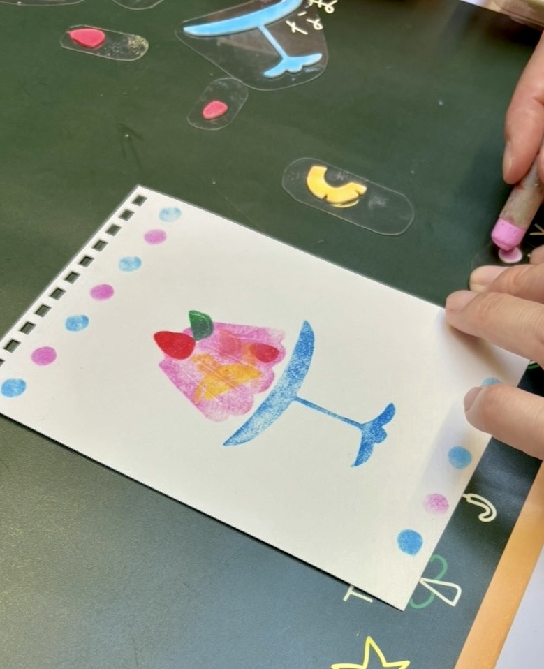 ここまでは全員同じ。その後に、カットしたフルーツや丸いスタンプで自由に盛り付けてもらいます。