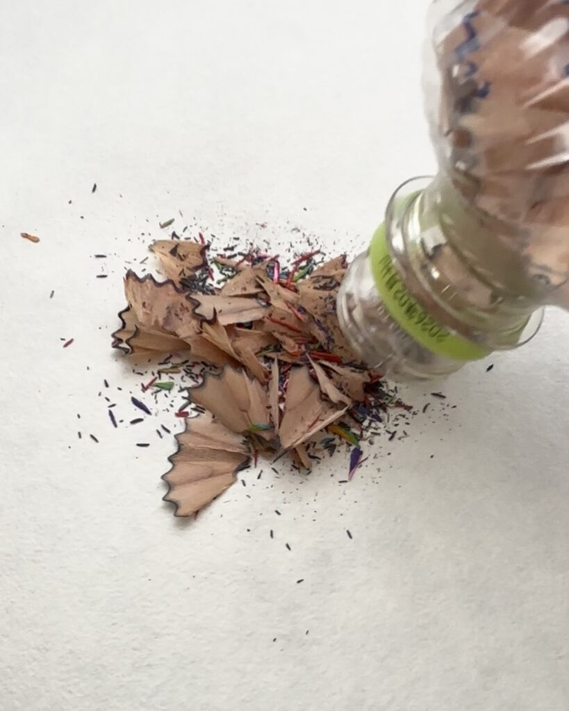ペットボトルを強めに振ってカスを細かくしてから、新聞紙やごみ箱などにトントンと衝撃を与えながら削りカスを出すと結構簡単に捨てることができます。